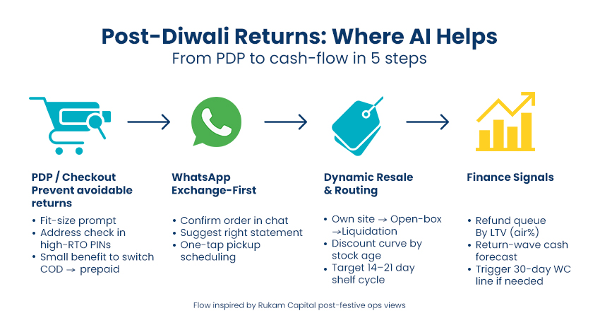 Returns are the feedback in a box across our portfolio companies. In the week after Diwali, the job is to move cash faster with fewer avoidable returns up front, exchange-first chats on WhatsApp, instant grading at the dock, and pricing that gets items back into baskets quickly.