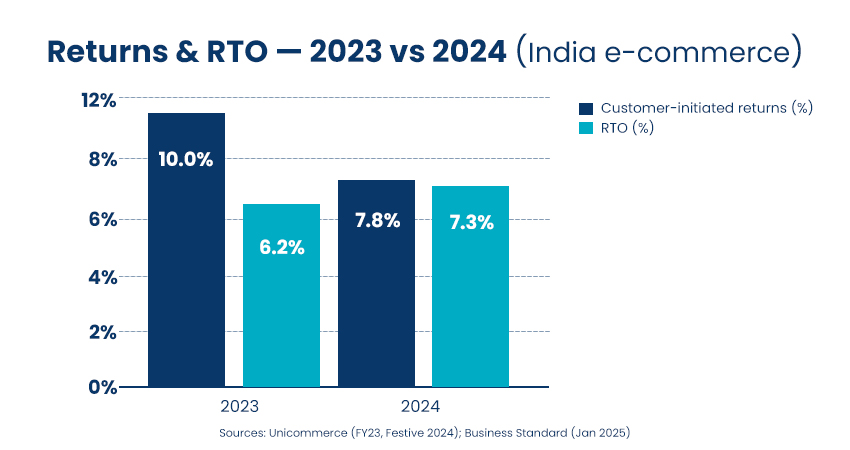 If you want a baseline for why this week matters, step back one year: return orders were ~10.4% of total sales in FY23 (compared to 9.8% in FY22), with apparel accounting for a significantly higher percentage. The 2024 drop to ~7.8% in customer-initiated returns is encouraging, resulting from clearer product descriptions, tighter sizing, and fewer “try-and-return” baskets. The catch is the RTO curve moving the other way—~7.3% in 2024 vs 6.2% in 2023, which is exactly where those behind-the-scenes rules and address hygiene earn their keep.